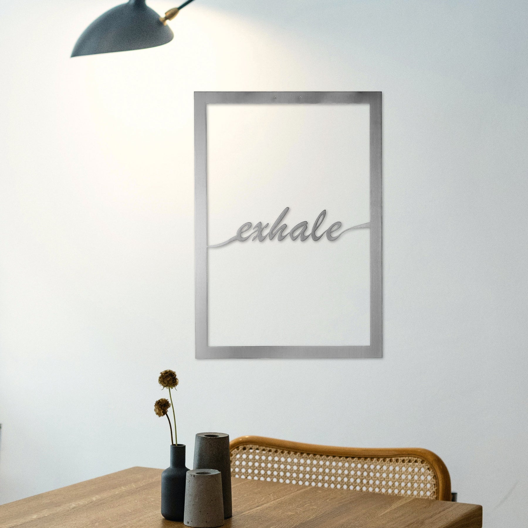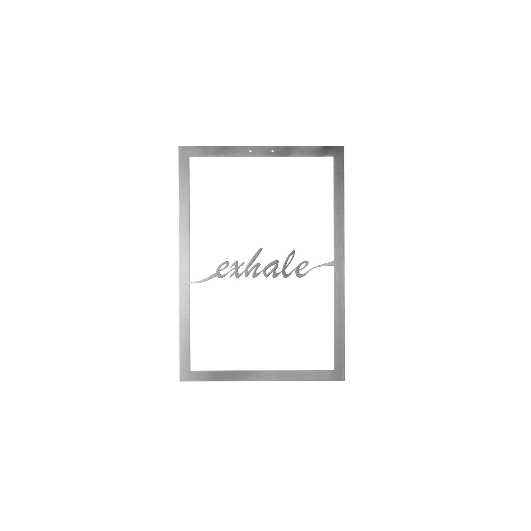 This “Exhale” metal wall art features a sleek, minimalist design with the word elegantly cut out in a modern, calming font.