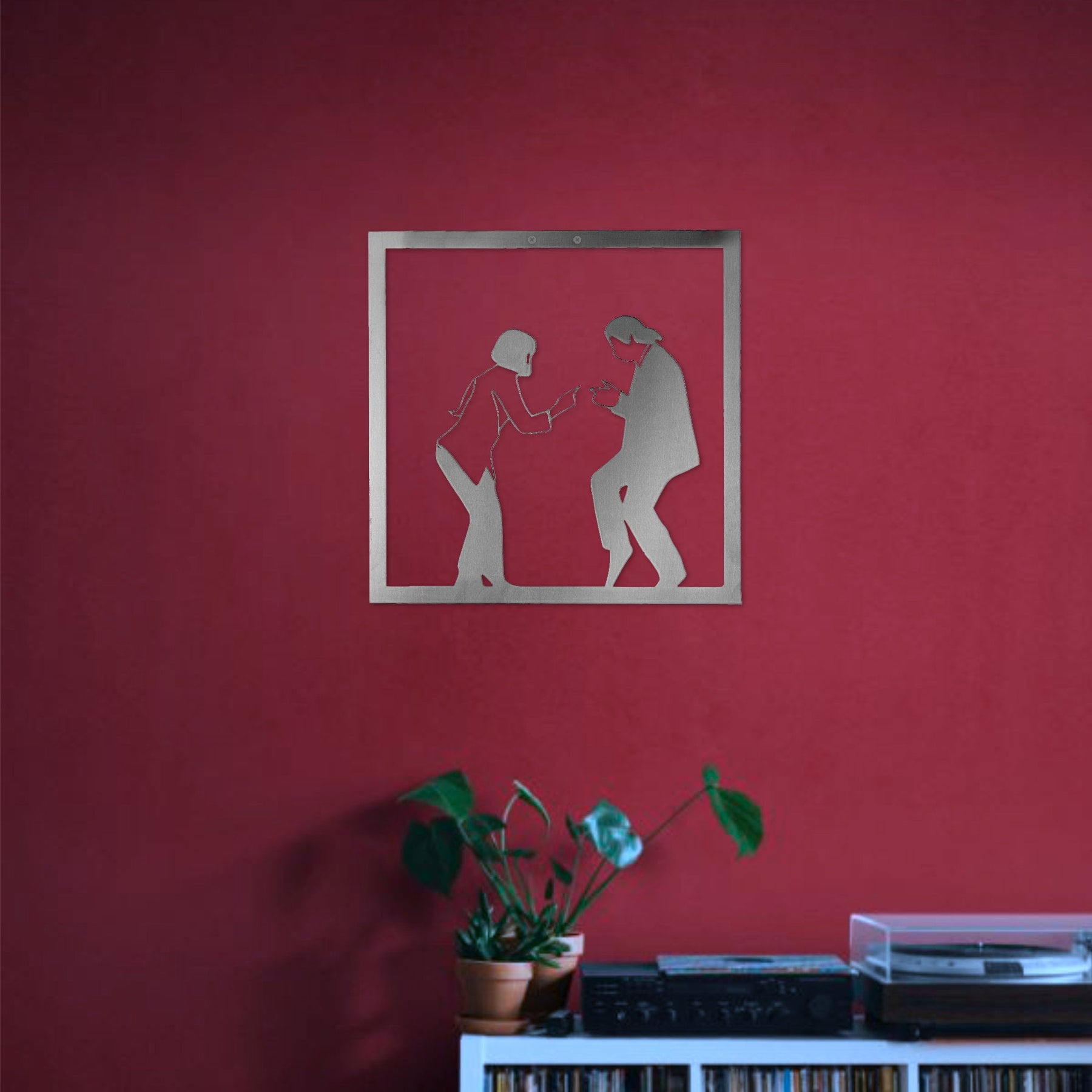 Pulp Fiction metal wall art on a red wall