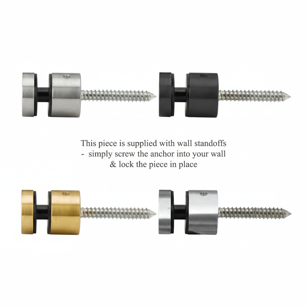 Wall standoffs for mounting large metal wall art on a white background